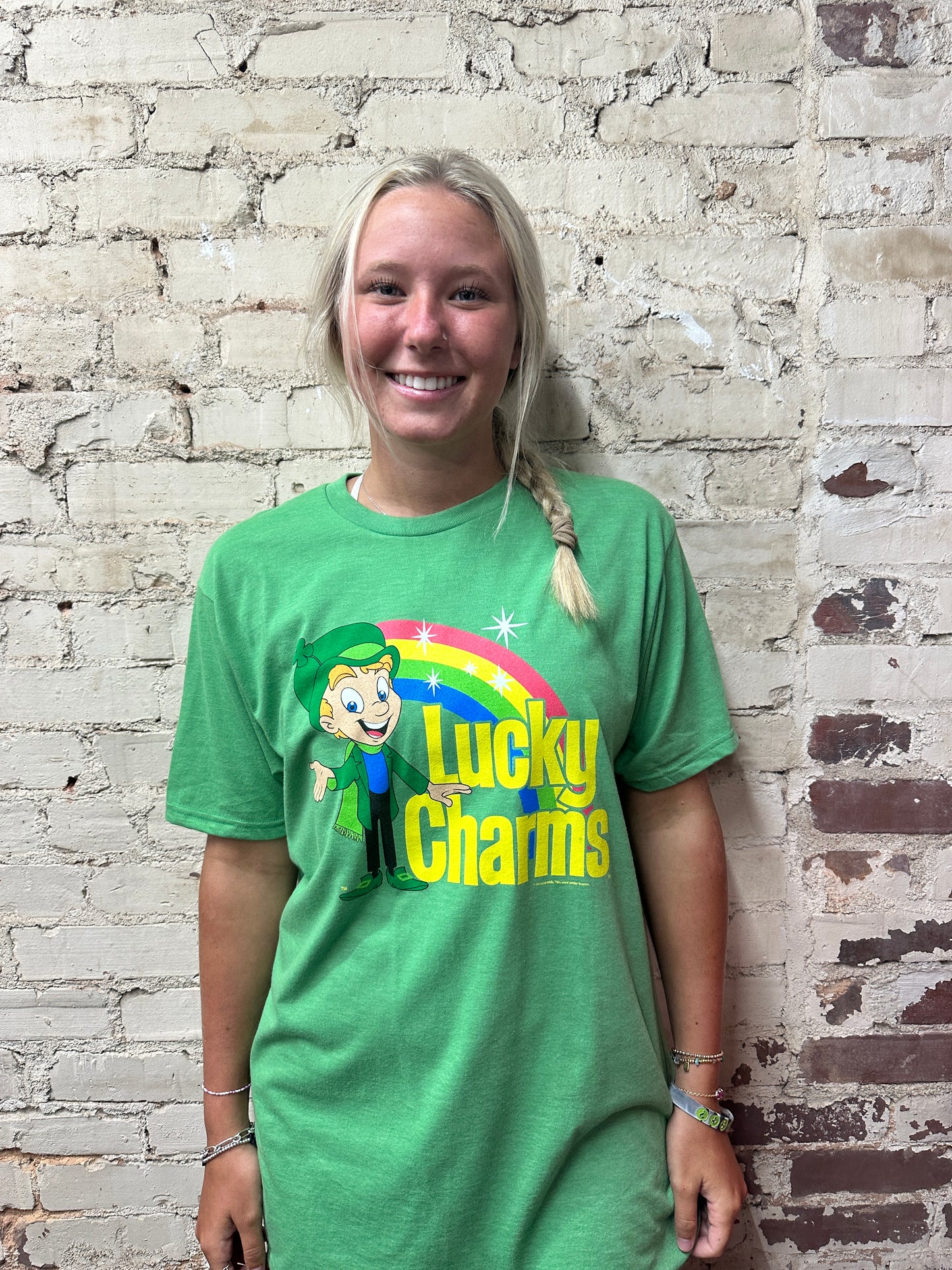 Step into a world of magic and whimsy with our Lucky Charms T-Shirt. Featuring the iconic cereal logo and colorful marshmallow shapes, this shirt is a nostalgic nod to everyone's favorite breakfast treat. Crafted from soft, high-quality fabric, it offers both comfort and style for your everyday adventures.